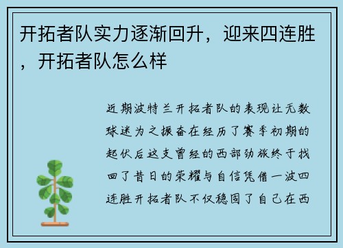 开拓者队实力逐渐回升,迎来四连胜,开拓者队怎么样